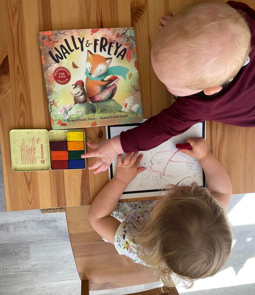 This coloring page and prompts provide a way for children and their caregivers or teachers to engage more deeply with Wally and Freya, a children’s picture book about restorative justice.